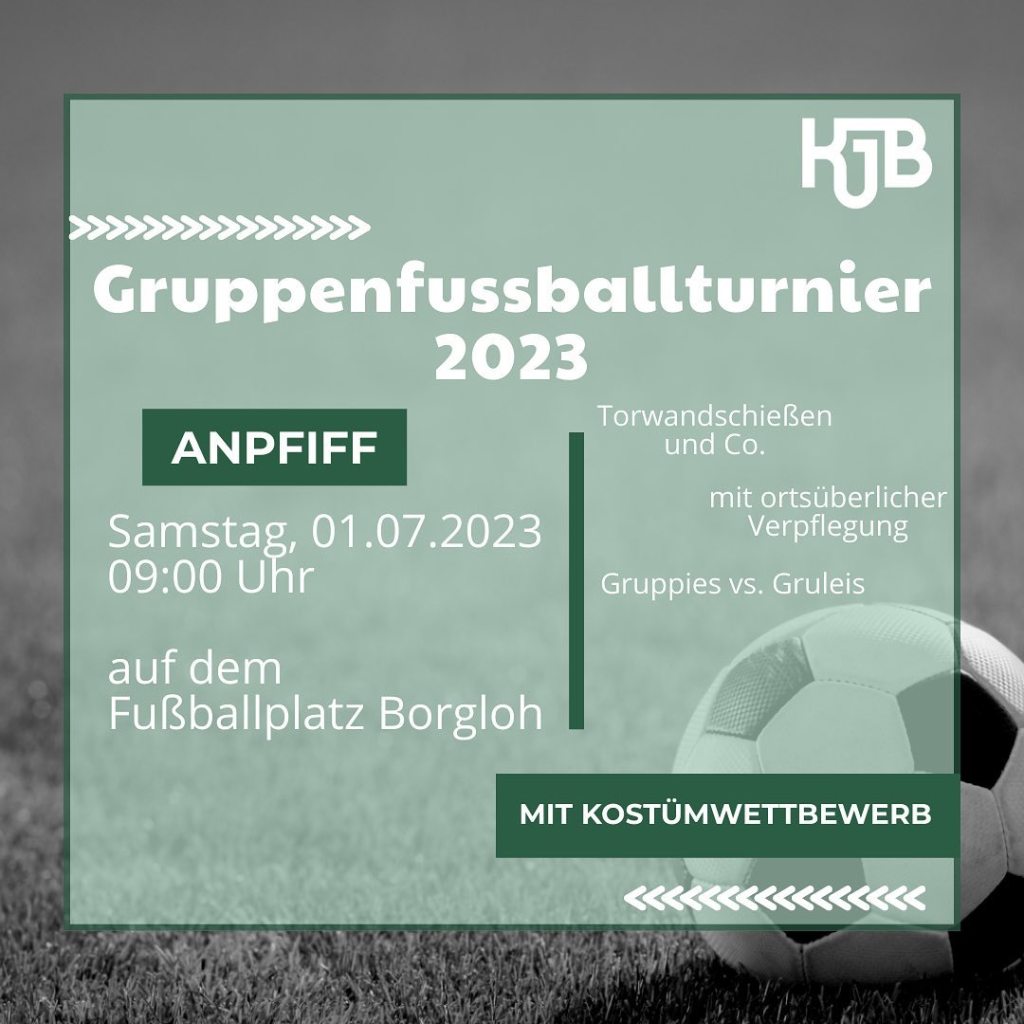 Am Samstag den 01.07.23 ist es wieder soweit. Das Gruppenfußballturnier findet auch dieses Jahr wieder statt. Ab 9 Uhr seid ihr herzlich eingeladen mit euren Gruppen auf dem Rasenplatz in Borgloh um den Turniersieg zu spielen⚽. Neben dem Fußballspiel könnt ihr euch auch anderweitig mit Torwandschießen und Pausenfüllerspielen beschäftigen. Für Verpflegung ist natürlich gesorgt und für ein bisschen Geld bekommt ihr bei uns Bratwurst, Getränke oder Süßigkeiten🌭🥤🍬. Für die beste Verkleidung gibt es außerdem einen Preis🏆.